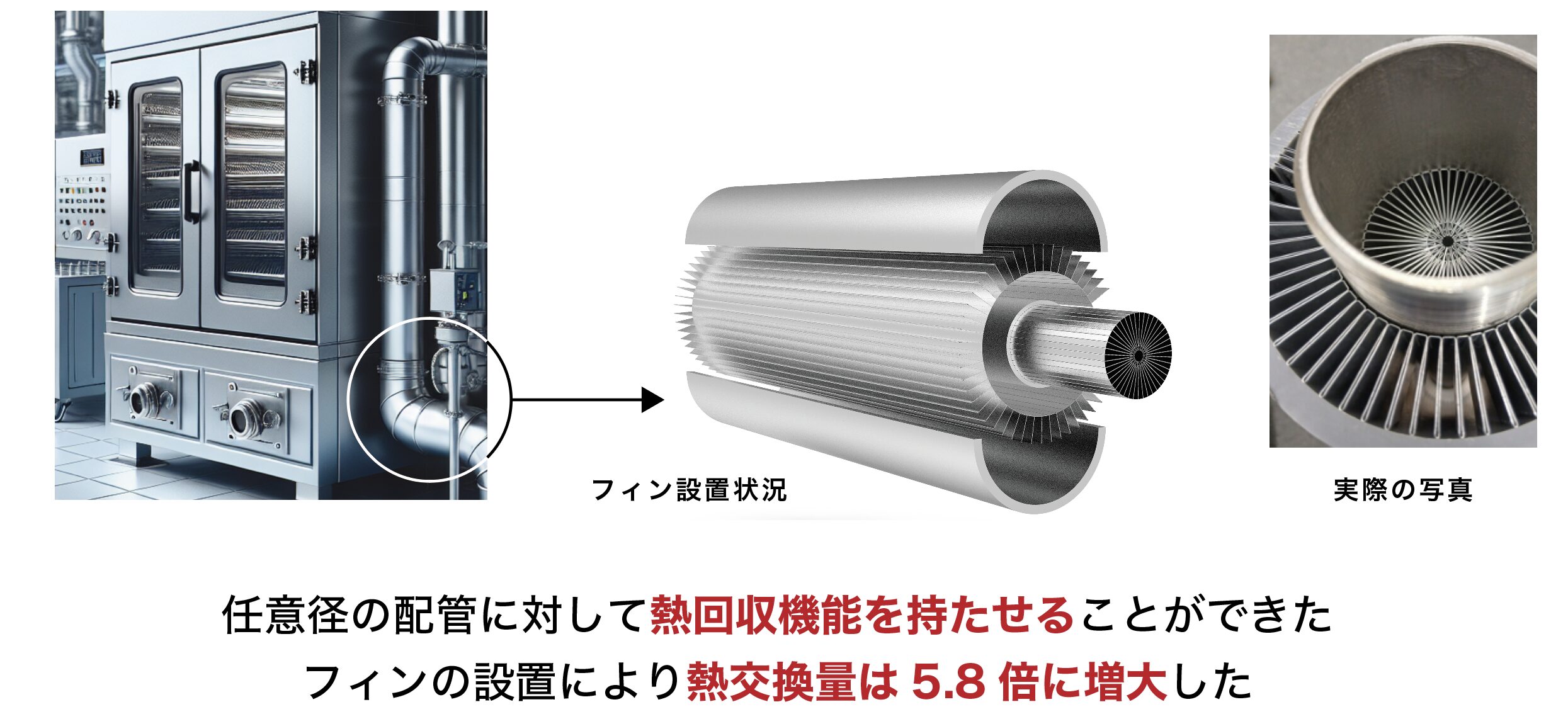 • 配管内外に対する伝熱フィンの設置により配管の表面積が増大して、効率よく熱回収することができた