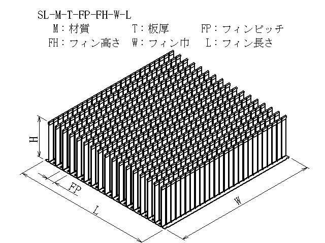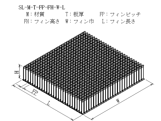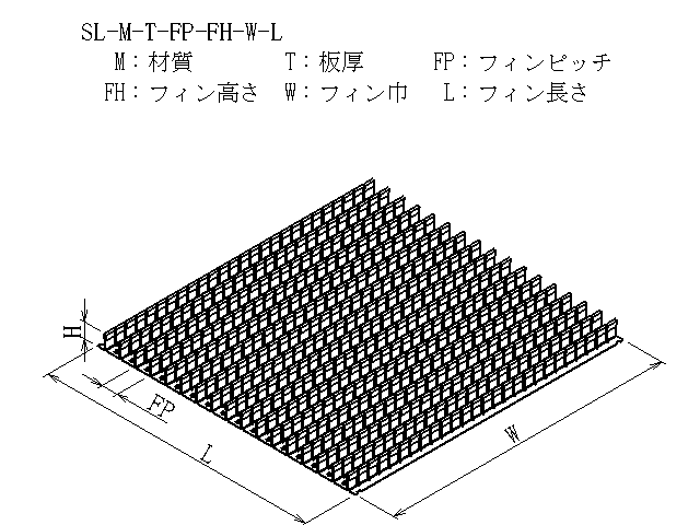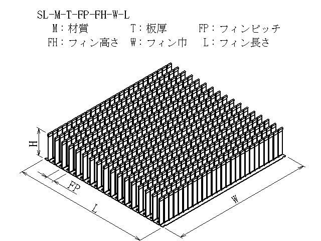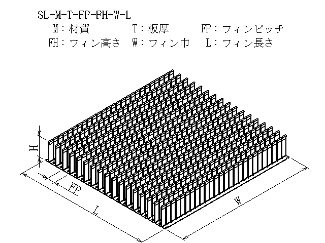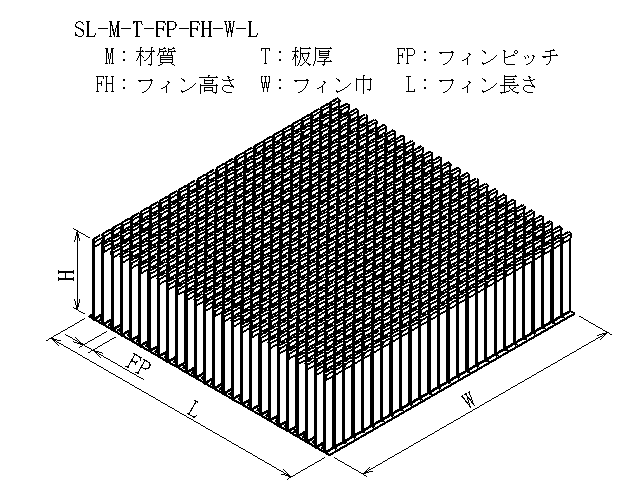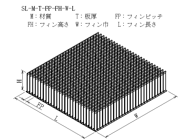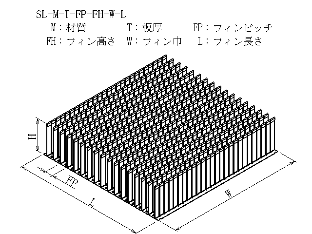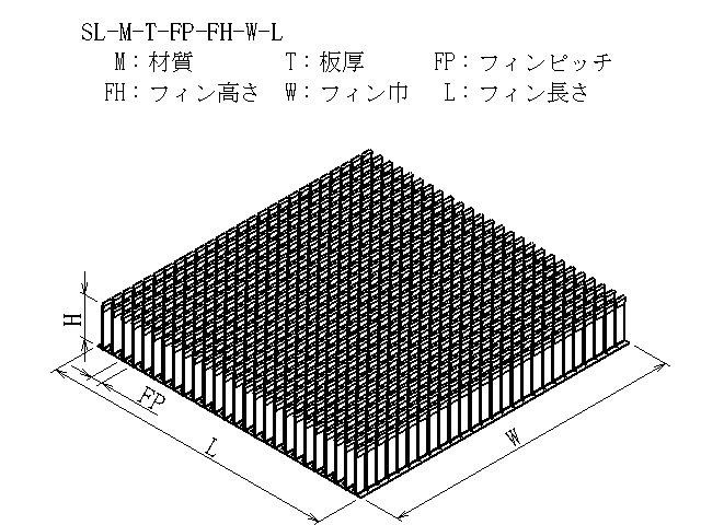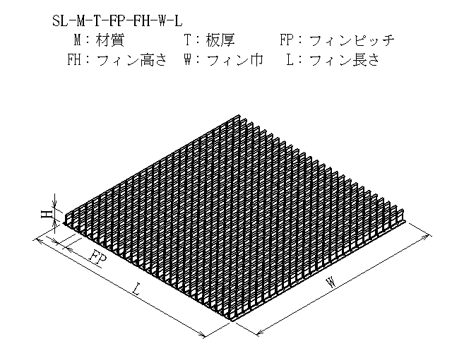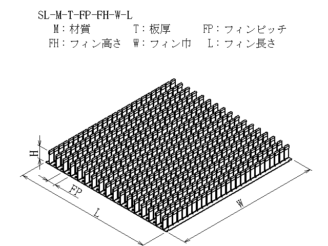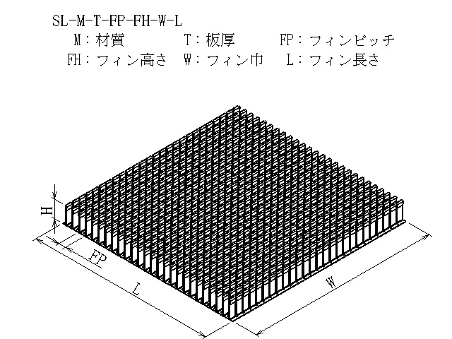 | 商品図番 | SL-[材質]-[板厚]-[フィンピッチ]-[フィン高さ]-[フィン巾]-[フィン長さ] |